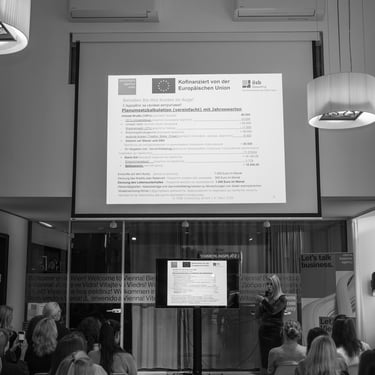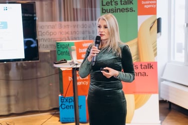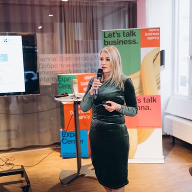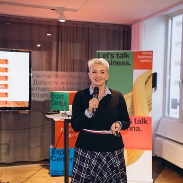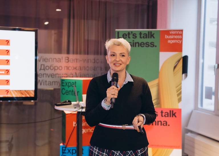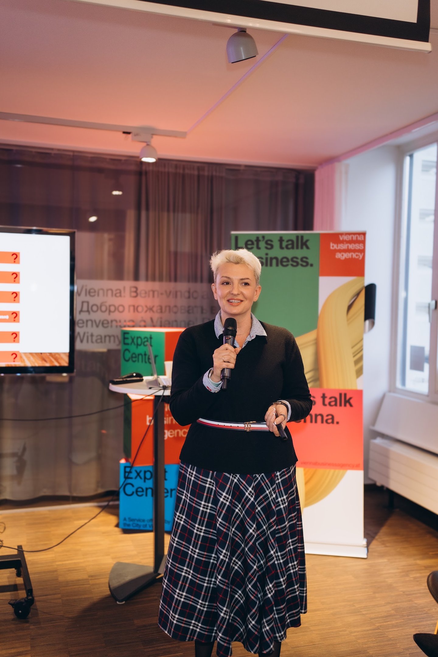 Participants received practical guidance on starting a business in Austria from Evgeniya Chulis, Business Consultant and Coach, who presented the Austrian business landscape and explained key steps for entrepreneurs — from legal forms and licensing to taxation, social security obligations, and support programs in Vienna, including the Founders Lab incubation initiative.